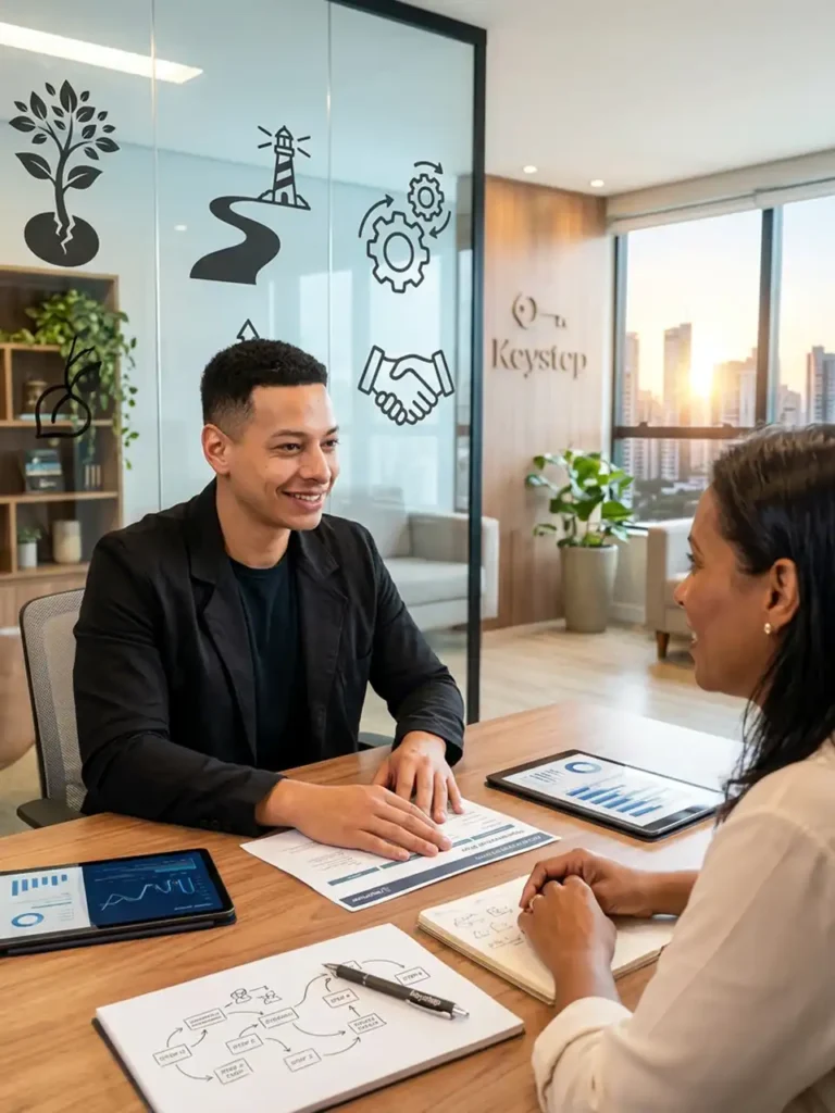 O que realmente nos distingue na Keystep é o nosso compromisso com um suporte integral e personalizado. Não oferecemos soluções genéricas; cada serviço é adaptado para as suas necessidades específicas, garantindo que você receba o máximo valor. Nossa equipe de especialistas está pronta para acompanhá-lo em cada etapa, desde a identificação de oportunidades até a implementação de estratégias de crescimento. Acreditamos que o sucesso é uma jornada colaborativa, e estamos aqui para ser o seu parceiro estratégico. Seja para refinar sua gestão empresarial, otimizar suas finanças ou desenvolver sua liderança, a Keystep oferece a expertise e o acolhimento que você precisa. Nosso objetivo é que você não apenas alcance seus objetivos, mas que os supere, construindo um legado duradouro. Permita-nos ser a consultoria de negócios que transforma desafios em oportunidades, e sonhos em realidade. Com a Keystep, você tem a certeza de um futuro promissor e de um negócio de sucesso que reflete sua paixão e dedicação.