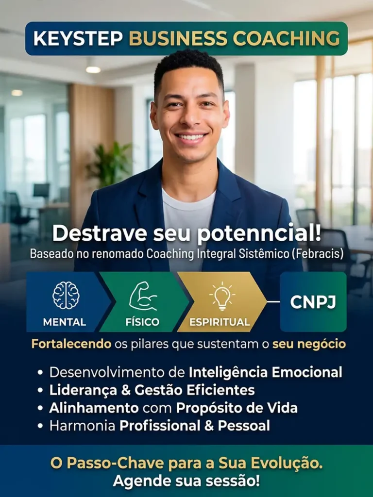 O processo de coaching da Keystep é baseado no renomado Coaching Integral Sistêmico, pelo sistema da Febracis, e é especificamente voltado para negócios. Este serviço visa destravar o potencial do empreendedor, fortalecendo os pilares espiritual, físico e mental que sustentam o seu CNPJ. Através de sessões personalizadas, ajudamos você a desenvolver a inteligência emocional necessária para enfrentar os desafios do mercado, aprimorar suas habilidades de liderança e gestão, e alinhar suas ações com seu propósito de vida.